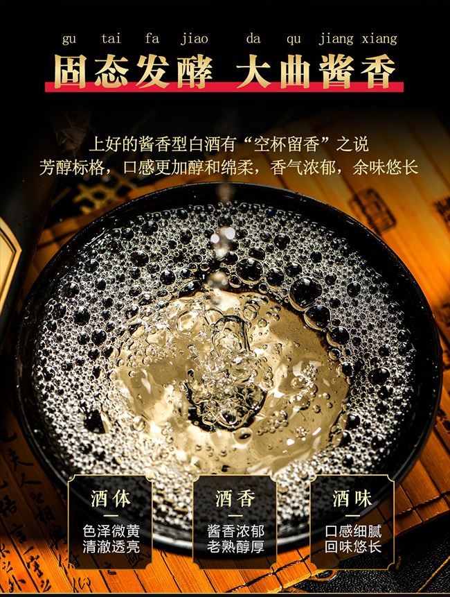 產(chǎn)品特點:酒味豐滿醇厚、幽雅細(xì)膩、回味悠久、空杯留香、香而不艷、低而不淡、醇香幽雅、不濃不猛、回味悠長
