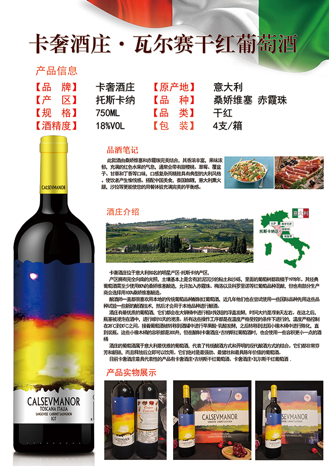 此款酒由桑嬌維塞和赤霞珠完美結合,其香濃豐富,果味濃郁,充滿的紅色水果的氣息,通常會帶有甜櫻桃、草莓、覆盆子、甘草和丁香等口味,口感復雜而精致具有典型的大利風格。使飲者產生愉悅感。搭配中國美食,泰國咖喱,意大利熏火腿,沙拉等更能使您的用餐體驗充滿完美的平衡感。
