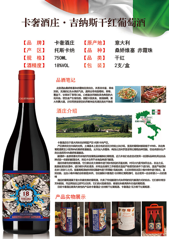 此款酒由桑嬌維塞和赤霞珠完美結合,其香濃豐富,果味濃郁,充滿的紅色水果的氣息,通常會帶有甜櫻桃、草莓、覆盆子、甘草和丁香等口味,口感復雜而精致具有典型的大利風格。使飲者產(chǎn)生愉悅感。搭配中國美食,泰國咖喱,意大利熏火腿,沙拉等更能使您的用餐體驗充滿完美的平衡感。
