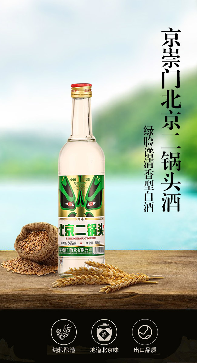 產(chǎn)品名:京崇門北京二鍋頭酒綠臉譜清香型白酒【42°56°500ml】
