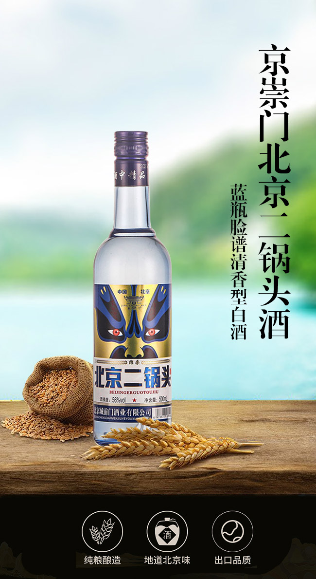 產(chǎn)品名:京崇門北京二鍋頭酒藍(lán)瓶臉譜清香型白酒【42°56°500ml】