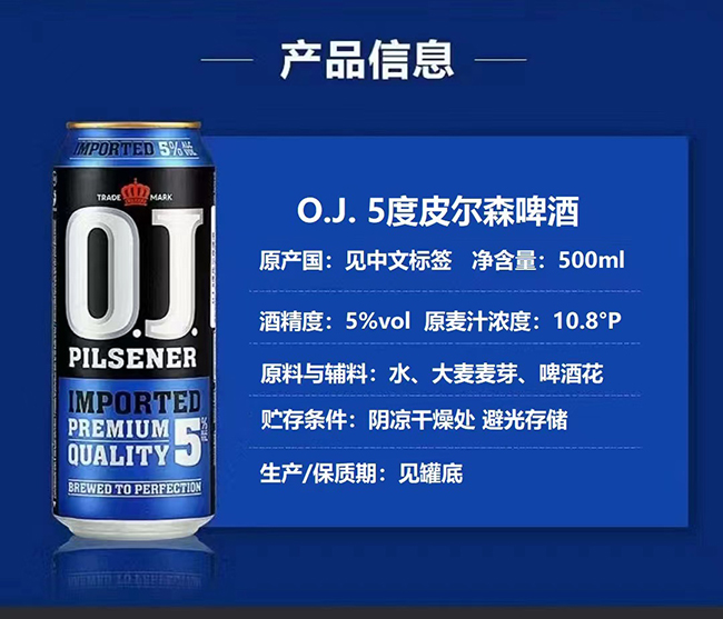 O. J. 5 度啤酒是一款口味清爽的皮爾森啤酒,采用的是純釀法,不添加玉米、大米等便宜且出汁率高的原料,只使用正宗優(yōu)質(zhì)小麥芽、酵母、SAAZ 啤酒花和水來釀造啤酒,以保持啤酒的純凈。
