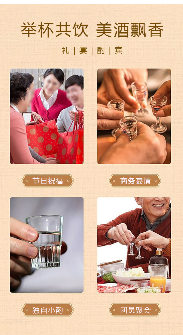 適飲場合:商務(wù)宴會(huì)、團(tuán)圓小酌、婚慶宴席、節(jié)日送禮、收藏
