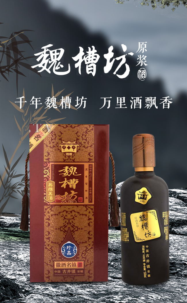 安徽魏槽坊酒業(yè)有限責(zé)任公司座落在華夏酒城安徽白酒之鄉(xiāng)——亳州市古井鎮(zhèn)。地處大京九鐵路沿線,自古以來,人杰地靈、物華天寶、資源豐富。公司釀造的白酒是通過“擇層取醅”、“擇時(shí)摘酒”等傳統(tǒng)技術(shù),得到精華的原漿美酒,再放入地下酒庫(kù)經(jīng)陶壇洞藏一定年限,使其自然老熟。