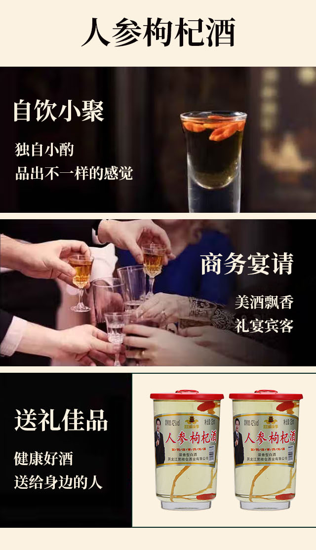 配料:高梁酒(蒸餾酒)、枸杞、白砂糖、人參(人工種植五年及五年以下)