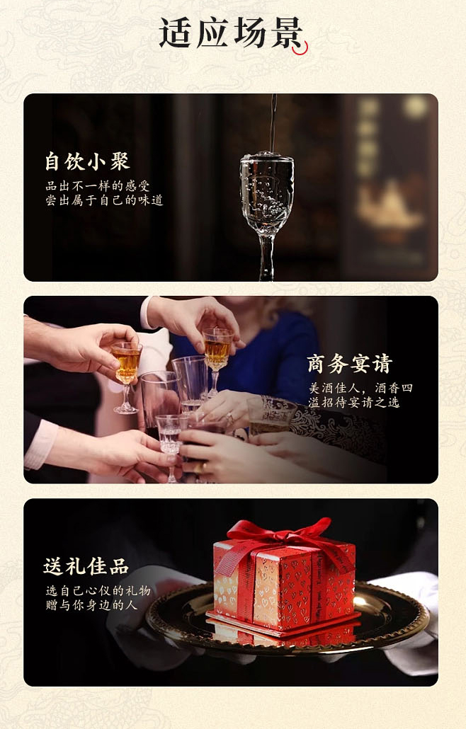 適飲場合:家庭聚會、自斟自飲、禮節(jié)拜訪、商務(wù)宴請、收藏等