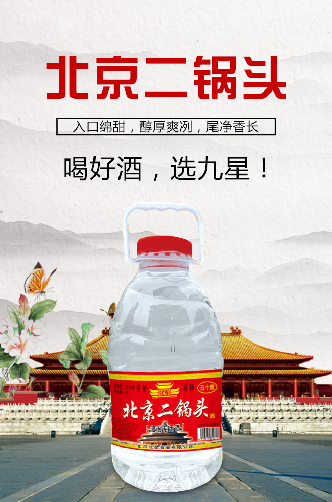 北京九星酒業(yè)有限公司是一家集產(chǎn)品研發(fā),生產(chǎn)銷售為一體的現(xiàn)代化白酒規(guī)模企業(yè)。目前開發(fā)的主要是皇城門系列白酒產(chǎn)品。是以優(yōu)質(zhì)高粱為主要原料,用大麥、小麥、豌豆制成大曲,輔多種微生物為糖化酵劑,再經(jīng)過(guò)長(zhǎng)期發(fā)酵,緩慢蒸餾,取之精華,經(jīng)多年陳貯后,精心勾兌而成。以“清香幽雅,醇厚綿甜,尾昧爽凈”的獨(dú)特風(fēng)格,深受各界朋友的青睞。