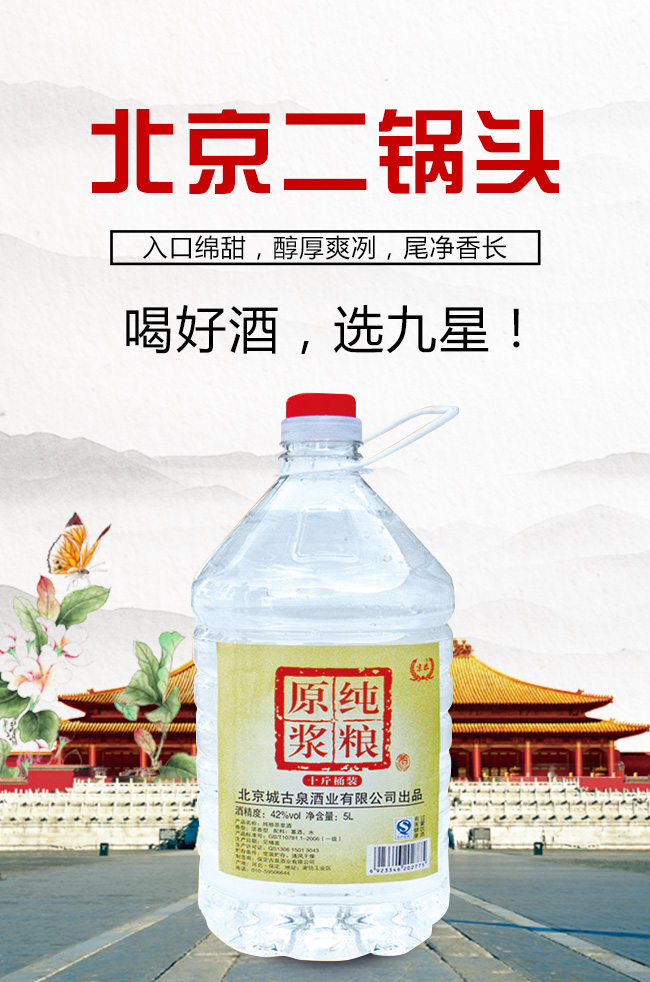 北京九星酒業(yè)有限公司是一家集產(chǎn)品研發(fā),生產(chǎn)銷(xiāo)售為一體的現(xiàn)代化白酒規(guī)模企業(yè)。目前開(kāi)發(fā)的主要是皇城門(mén)系列白酒產(chǎn)品。是以?xún)?yōu)質(zhì)高粱為主要原料,用大麥、小麥、豌豆制成大曲,輔多種微生物為糖化酵劑,再經(jīng)過(guò)長(zhǎng)期發(fā)酵,緩慢蒸餾,取之精華,經(jīng)多年陳貯后,精心勾兌而成。以“清香幽雅,醇厚綿甜,尾昧爽凈”的獨(dú)特風(fēng)格,深受各界朋友的青睞。