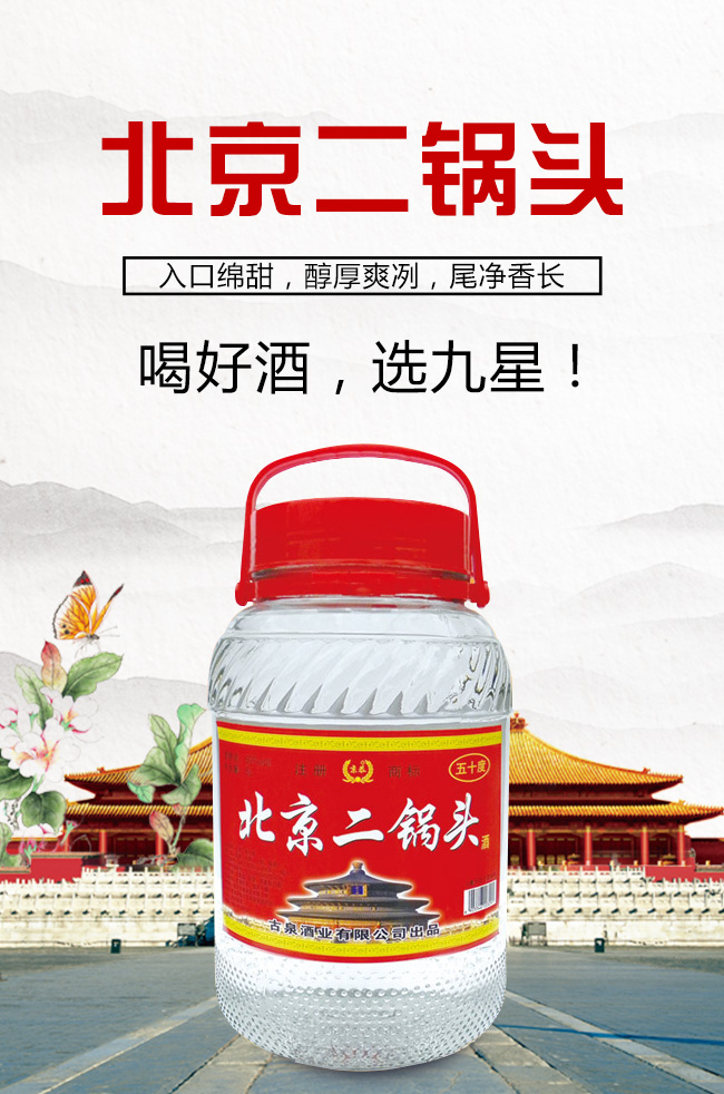 北京九星酒業(yè)有限公司是一家集產(chǎn)品研發(fā),生產(chǎn)銷(xiāo)售為一體的現(xiàn)代化白酒規(guī)模企業(yè)。目前開(kāi)發(fā)的主要是皇城門(mén)系列白酒產(chǎn)品。是以優(yōu)質(zhì)高粱為主要原料,用大麥、小麥、豌豆制成大曲,輔多種微生物為糖化酵劑,再經(jīng)過(guò)長(zhǎng)期發(fā)酵,緩慢蒸餾,取之精華,經(jīng)多年陳貯后,精心勾兌而成。以“清香幽雅,醇厚綿甜,尾昧爽凈”的獨(dú)特風(fēng)格,深受各界朋友的青睞。