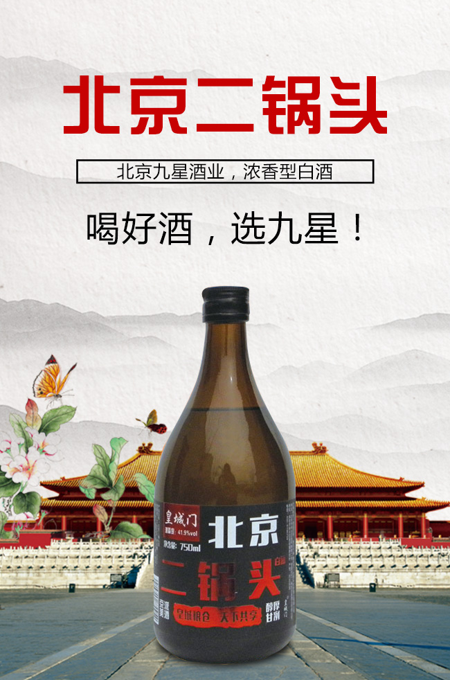 北京九星酒業(yè)有限公司是一家集產(chǎn)品研發(fā),生產(chǎn)銷售為一體的現(xiàn)代化白酒規(guī)模企業(yè)。目前開(kāi)發(fā)的主要是皇城門系列白酒產(chǎn)品。是以優(yōu)質(zhì)高粱為主要原料,用大麥、小麥、豌豆制成大曲,輔多種微生物為糖化酵劑,再經(jīng)過(guò)長(zhǎng)期發(fā)酵,緩慢蒸餾,取之精華,經(jīng)多年陳貯后,精心勾兌而成。以“清香幽雅,醇厚綿甜,尾昧爽凈”的獨(dú)特風(fēng)格,深受各界朋友的青睞。
