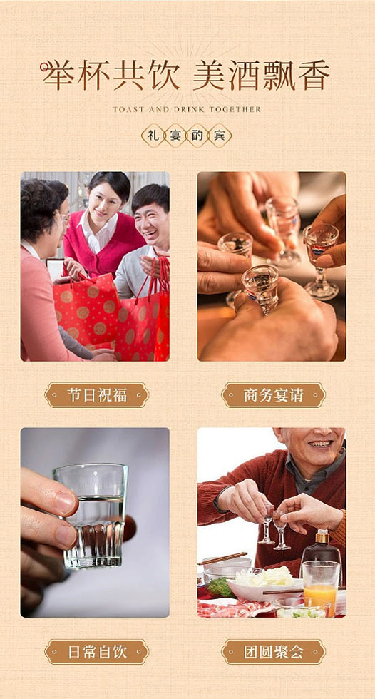適飲場合:商務(wù)宴會、團(tuán)圓小酌、婚慶宴席、節(jié)日送禮、收藏等