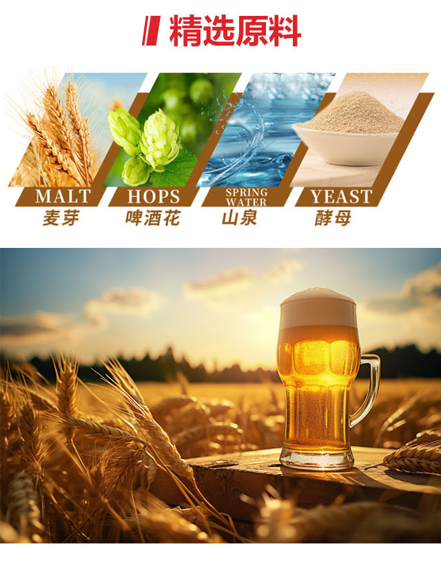 水系采用400米深井,經(jīng)反滲透處理后的純凈水,引進(jìn)了澳大利亞優(yōu)質(zhì)大麥芽及東北粳米、美國(guó)產(chǎn)酒花、德國(guó)釀造工藝和低溫長(zhǎng)時(shí)間后熟技術(shù),歷經(jīng)30多天精心慢釀而成。