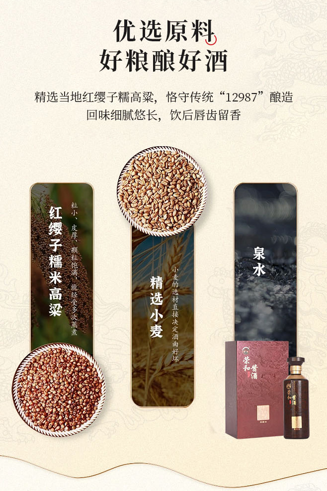 公司一貫高度重視質(zhì)量,堅持走質(zhì)量效益型道路。由一大批長期從事釀酒生產(chǎn)科研的專業(yè)技術(shù)人才嚴(yán)把質(zhì)量關(guān)。產(chǎn)品開發(fā)已形成系列,先后研制開發(fā)出了榮和醬酒系列、榮和經(jīng)典系列、榮和燒坊系列、百年榮和系列等酒。