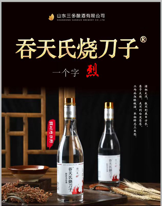 經過初步策劃開發(fā),現(xiàn)主要有吞天氏燒刀子酒,薯實黑蒜酒,咕嘍咕嘍酒,地瓜燒酒、地瓜干酒等系列產品,2018年6月試運營以來深受山東及周邊多省地區(qū)人民的喜愛,并得到各同行和客戶的信任和贊譽。經典瓶形,簡單包裝,“甜、綿、軟、凈、香”的獨特風格,爭取在當今酒水品牌眾多的市場形勢下,闖出屬于我們的一片天空!