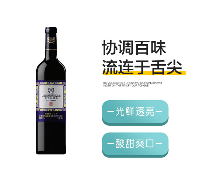品鑒:本酒采用獨特發(fā)酵工藝精釀而成,石榴酒酒體純正,色澤光亮透明,酸甜爽口,保留了石榴酸、甜、澀、鮮之 天然風(fēng)味,其風(fēng)格獨特。