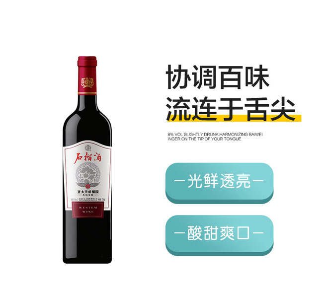品鑒:本酒采用獨特發(fā)酵工藝精釀而成,石榴酒酒體純正,色澤光亮透明,酸甜爽口,保留了石榴酸、甜、澀、鮮之 天然風味,其風格獨特。