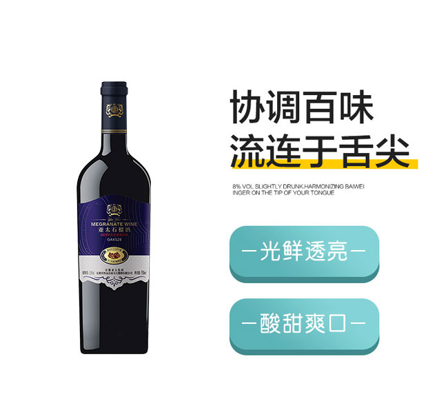 品鑒:本酒采用獨(dú)特發(fā)酵工藝精釀而成,石榴酒酒體純正,色澤光亮透明,酸甜爽口,保留了石榴酸、甜、澀、鮮之 天然風(fēng)味,其風(fēng)格獨(dú)特。