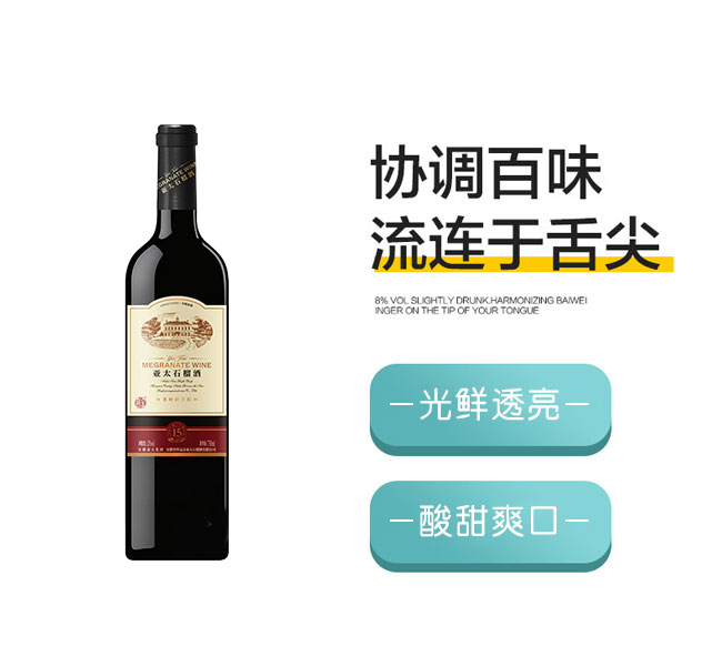 品鑒:本酒采用獨特發(fā)酵工藝精釀而成,石榴酒酒體純正,色澤光亮透明,酸甜爽口,保留了石榴酸、甜、澀、鮮之 天然風(fēng)味,其風(fēng)格獨特。