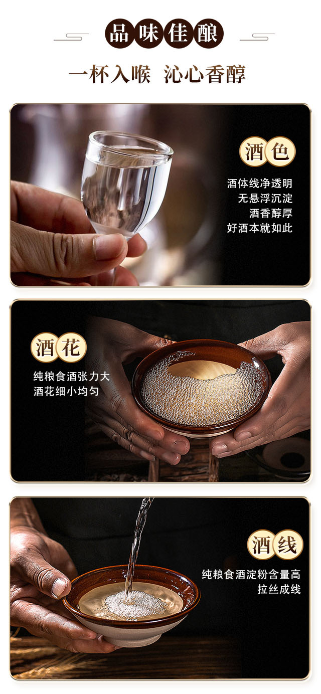 常年充足的雨水和陽光,讓高粱、小麥、大麥、玉米、豌豆等農(nóng)作物綠色健康的成長(zhǎng),也讓深藏地下幾百米的優(yōu)質(zhì)礦泉源源流長(zhǎng);四季分明的季節(jié)氣候,給了四種不同溫酒曲發(fā)酵適合的溫床,更讓明清至今的老窖窖泥菌群活躍、歷久彌芳;忠于本真的善農(nóng)坊釀酒人承繼了徽酒傳統(tǒng)釀造技藝,承傳古法“老窖池固態(tài)發(fā)酵”,全部采用陶壇儲(chǔ)存。古老的釀酒技藝,其特點(diǎn)就是:老窖池發(fā)酵、純糧食釀造、不添加食用酒精、香精香料及甜蜜素等添加劑。包裝返璞歸真,不取悅消費(fèi)者,這種特點(diǎn)使產(chǎn)品具備了地理文化個(gè)性與民間古法傳承技藝個(gè)性。