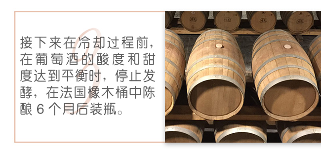 接下來在冷卻過程前,在葡萄酒的酸度和甜度達到平衡時,停止發(fā)酵,在法國橡木桶中陳釀6個月后裝瓶。