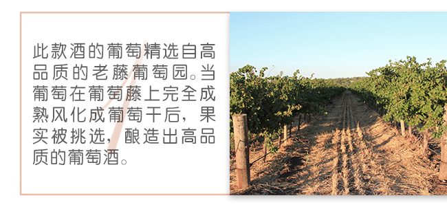 此款酒的葡萄精選自高品質(zhì)的老藤葡萄園。當(dāng)葡萄在葡萄藤上完全成熟風(fēng)化成葡萄干后,果實被挑選,釀造出高品質(zhì)的葡萄酒。