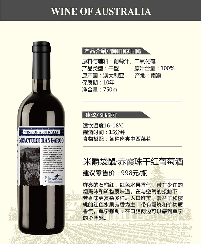 產(chǎn)品名:米爵袋鼠赤霞珠干紅葡萄酒13°750ml