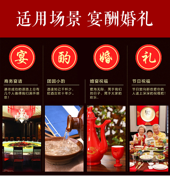 適飲場(chǎng)合:商務(wù)宴會(huì)、團(tuán)圓小酌、婚慶宴席、節(jié)日送禮、收藏等