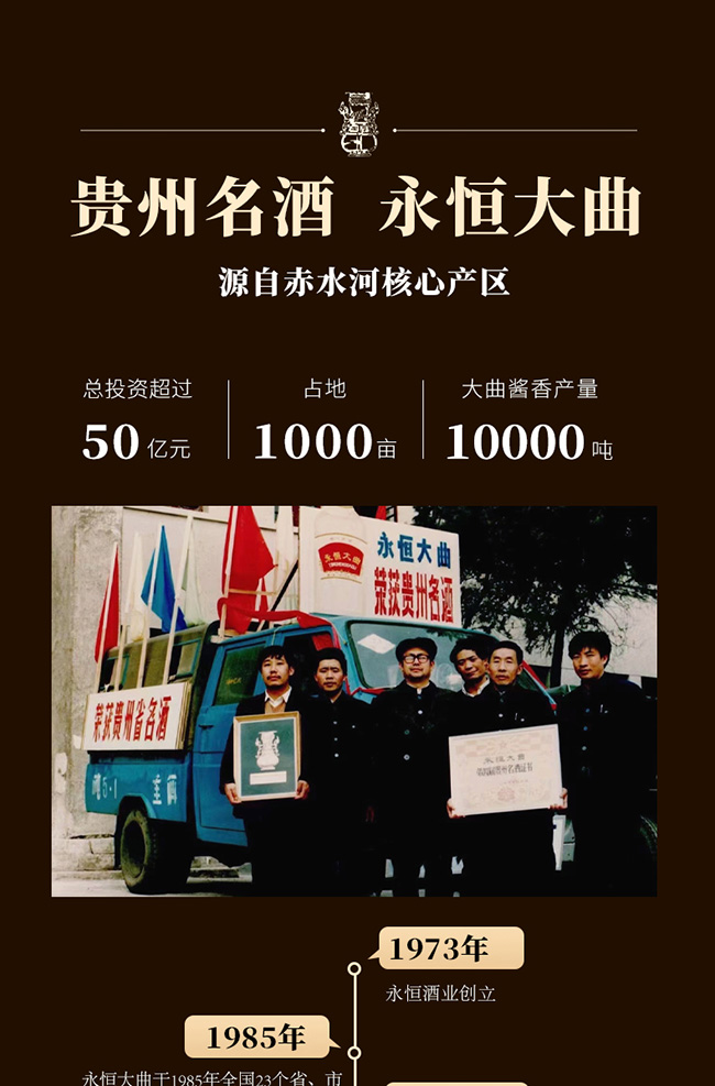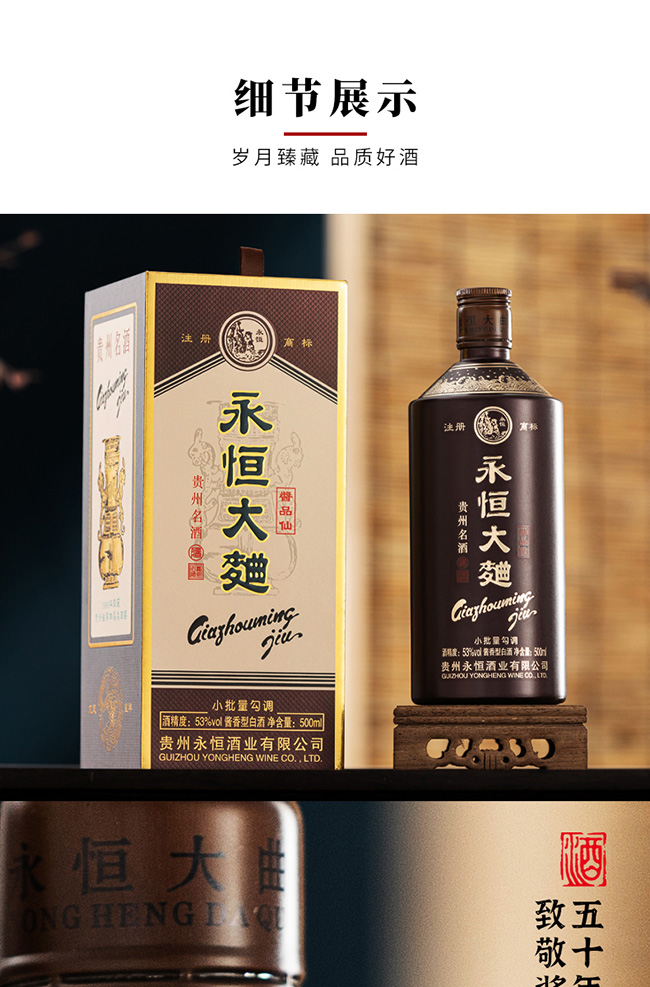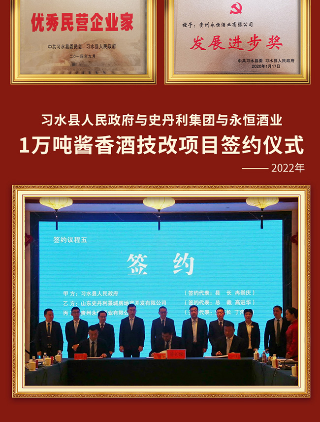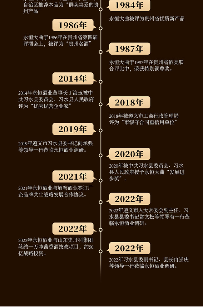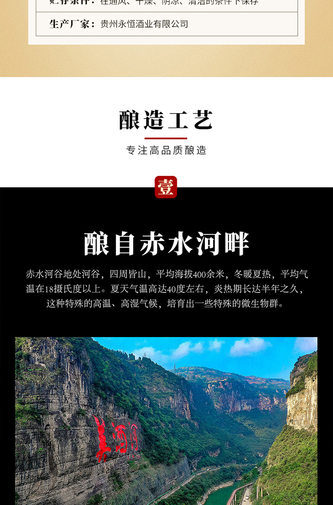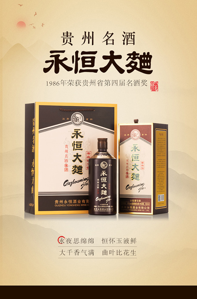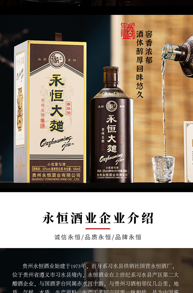 貴州永恒酒業(yè)始建于1973年,前身系習水縣供銷社國營永恒酒廠,位于貴州省遵義市習水縣境內(nèi),永恒酒業(yè)在上世紀系習水縣產(chǎn)區(qū)第二大釀酒企業(yè),與國酒茅臺同屬赤水河中游,與貴州習酒相鄰僅幾公里,地質(zhì)、氣候、水質(zhì)、生產(chǎn)原料、生產(chǎn)工藝同宗同源一脈相傳,是為中國醬香型白酒赤水河核心產(chǎn)區(qū),均系赤水河谷微生物圈地域,有著釀制醬香型白酒得天獨厚地理條件,酒廠現(xiàn)規(guī)劃占地1500余畝,酒廠主要經(jīng)營“永恒”品牌系列產(chǎn)品,旗下“永恒大曲”于1986年榮獲“貴州名酒”;1987年在貴州省第四屆評酒會上被評為“特別金獎”。?通過幾代永恒人的傳承與堅守,近年來公司著力打造誠信永恒、品質(zhì)永恒、品牌永恒的企業(yè)核心,堅守傳承傳統(tǒng)釀造工藝初心與市場經(jīng)濟創(chuàng)新營銷的決心。