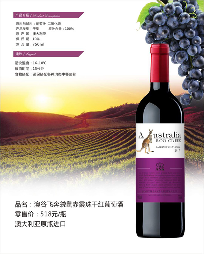 產(chǎn)品名:澳谷飛奔袋鼠赤霞珠干紅葡萄酒13°750ml