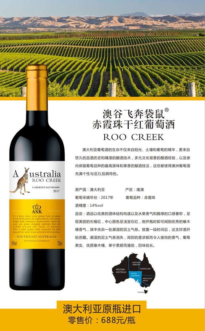 產(chǎn)品名:澳谷飛奔袋鼠赤霞珠干紅葡萄酒14°750ml