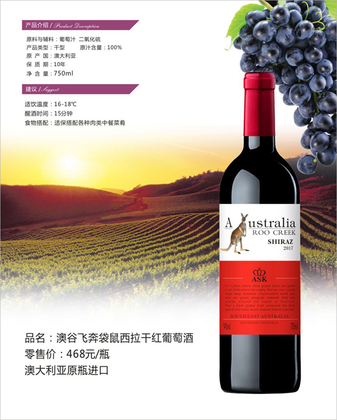【產(chǎn)品名稱(chēng)】澳谷飛奔袋鼠西拉干紅葡萄酒13°750ml