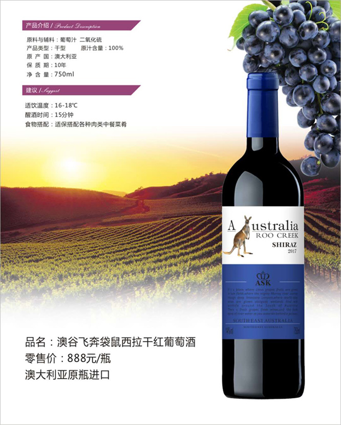 產(chǎn)品名:澳谷飛奔袋鼠西拉干紅葡萄酒750ml