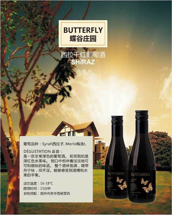 產(chǎn)品名:蝶谷莊園西拉干紅葡萄酒750ml