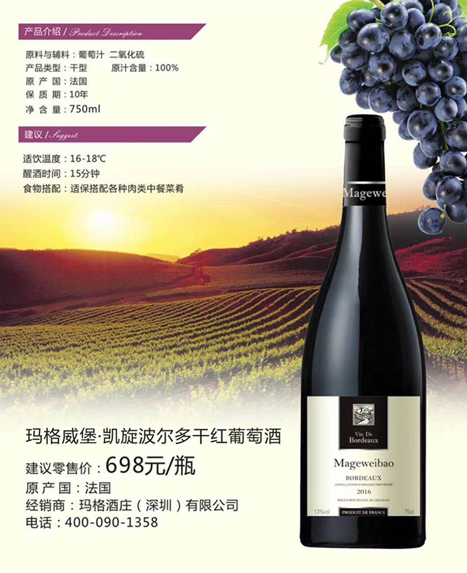 產(chǎn)品名:瑪格威堡凱旋波爾多干紅葡萄酒13°750ml
