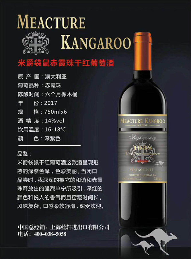 產品名:米爵袋鼠赤霞珠干紅葡萄酒14°750ml