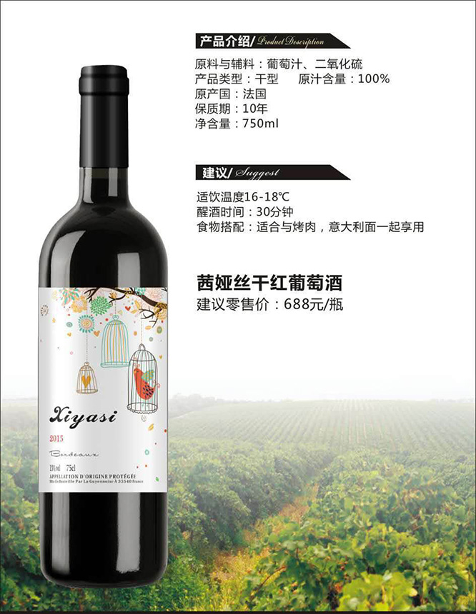 產(chǎn)品名:茜婭絲干紅葡萄酒2015 13°750ml