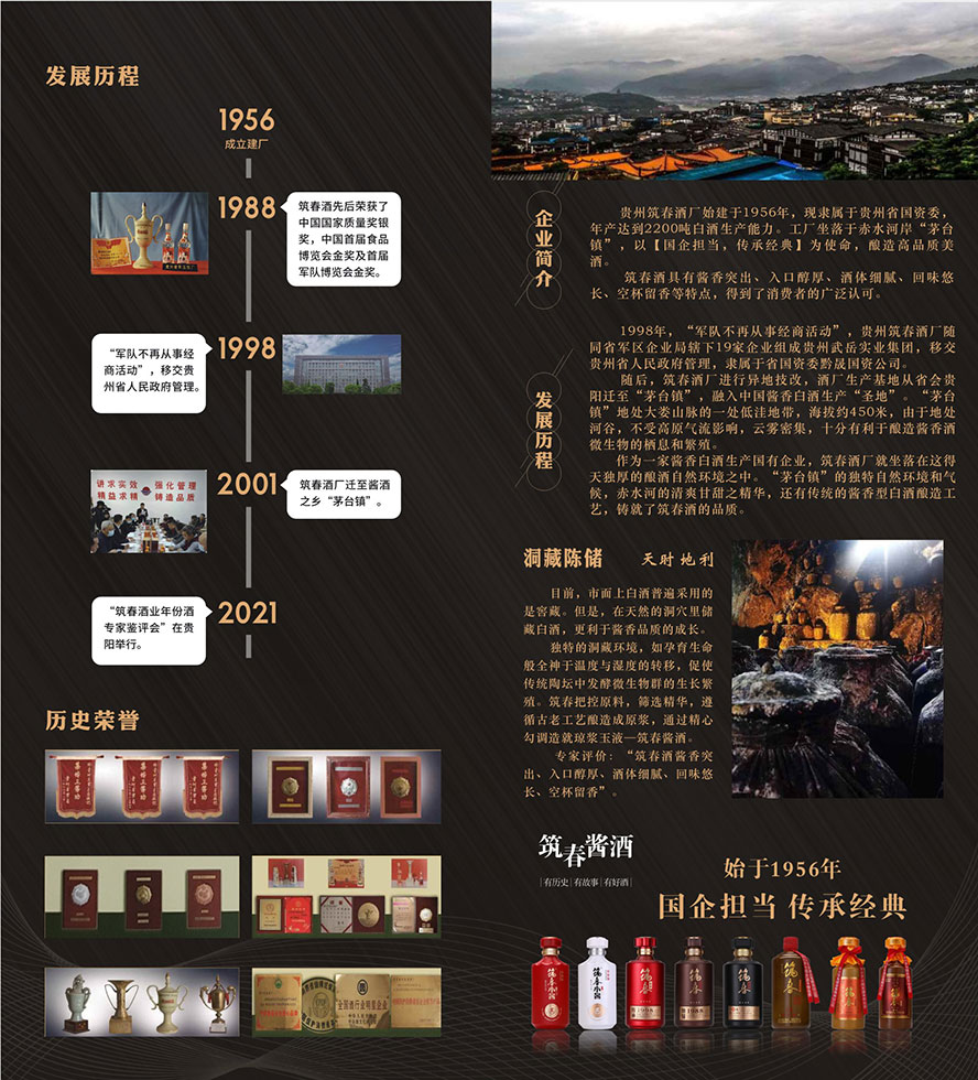 貴州筑春酒廠始建于1956年,現(xiàn)隸屬于貴州省國資委,年產達到2200噸白酒生產能力。工廠坐落于赤水河岸“茅臺鎮(zhèn)”,以【國企擔當,傳承經典】為使命,釀造高品質美酒。