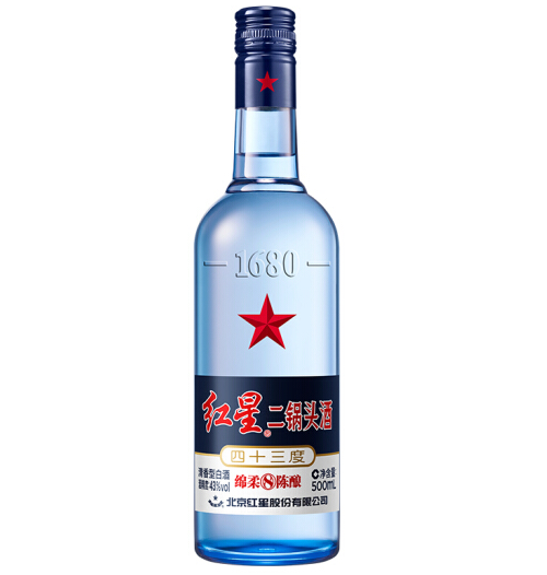 紅星藍瓶二鍋頭綿柔8陳釀43度500ml清香型
