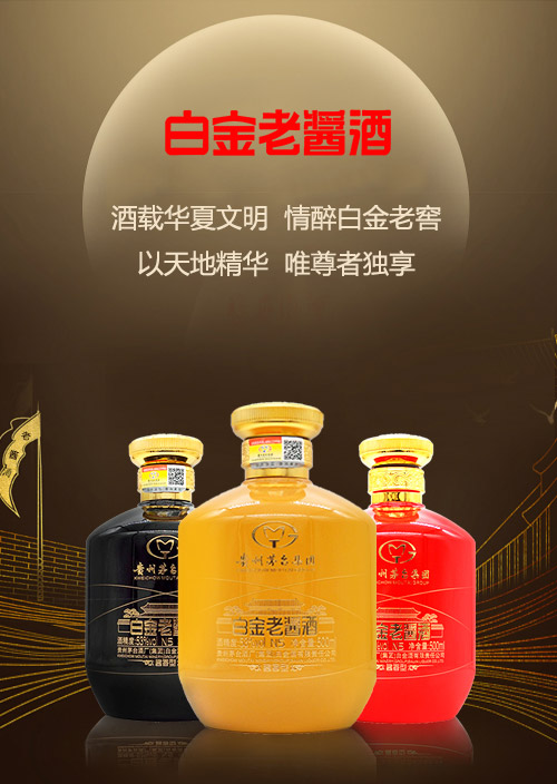 白金老醬酒是53度國標(biāo)優(yōu)級醬香型白酒,是茅臺集團(tuán)白金酒公司經(jīng)過近十年消費(fèi)市場研究,用五年時間研發(fā)出的核心產(chǎn)品,是茅臺集團(tuán)一千億工程著力打造的核心產(chǎn)品。