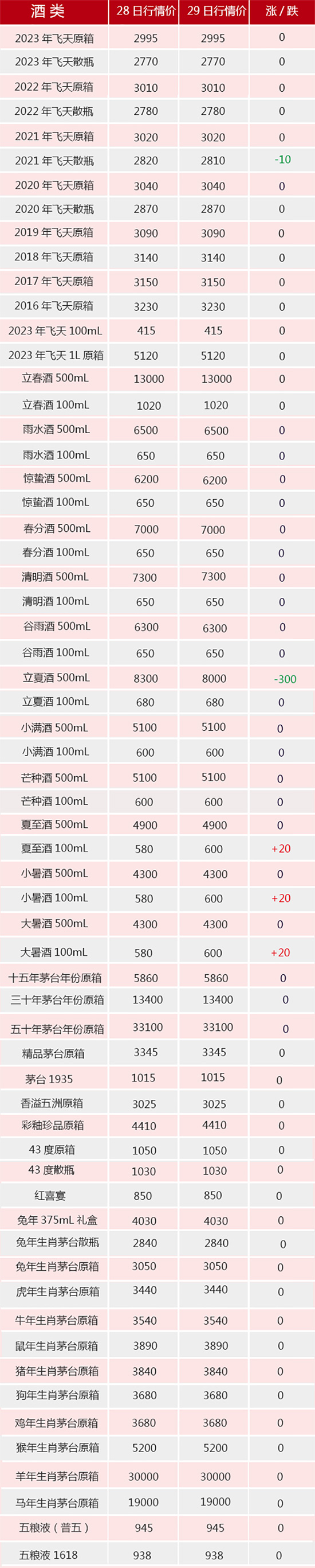 8月29日茅臺(tái)酒行情價(jià)。飛天方面,2021年散瓶跌10元/瓶;生肖方面,無(wú)漲跌;其他系列,大立夏酒跌300元/瓶,多款小節(jié)氣酒漲20元/瓶。