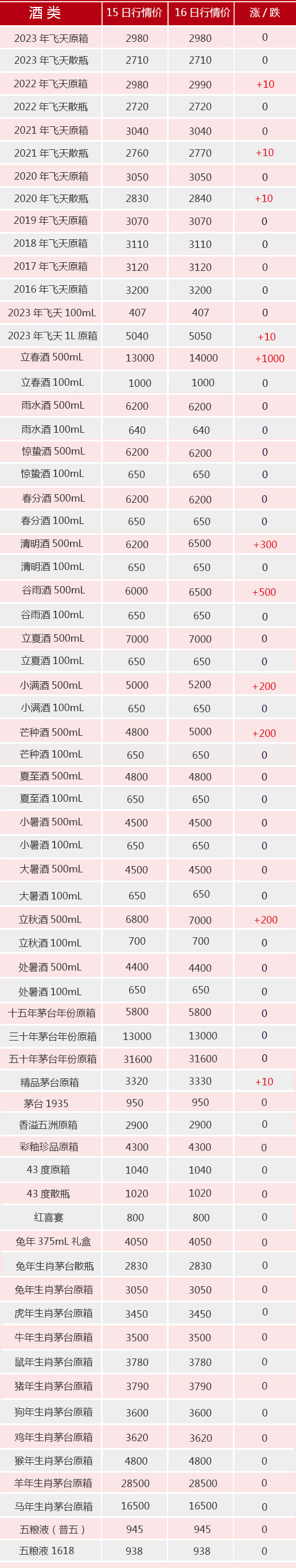 11月16日茅臺酒行情價。飛天方面,2021~2022散瓶、2022年散瓶和2023年1L原箱漲10元/瓶;生肖方面無動價;其他系列,大立春酒漲1000元/瓶,多款大節(jié)氣酒再漲200~500元/瓶。
